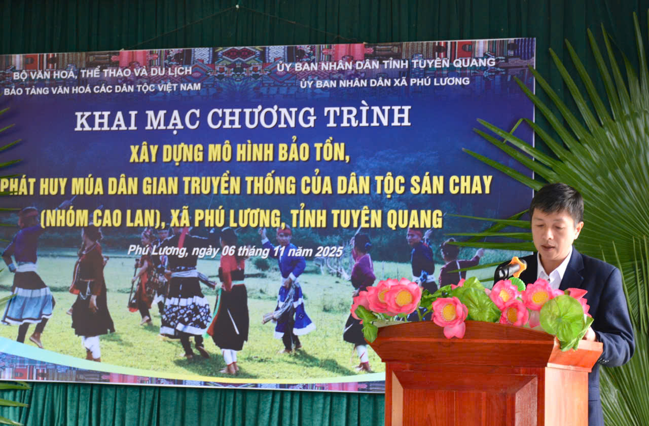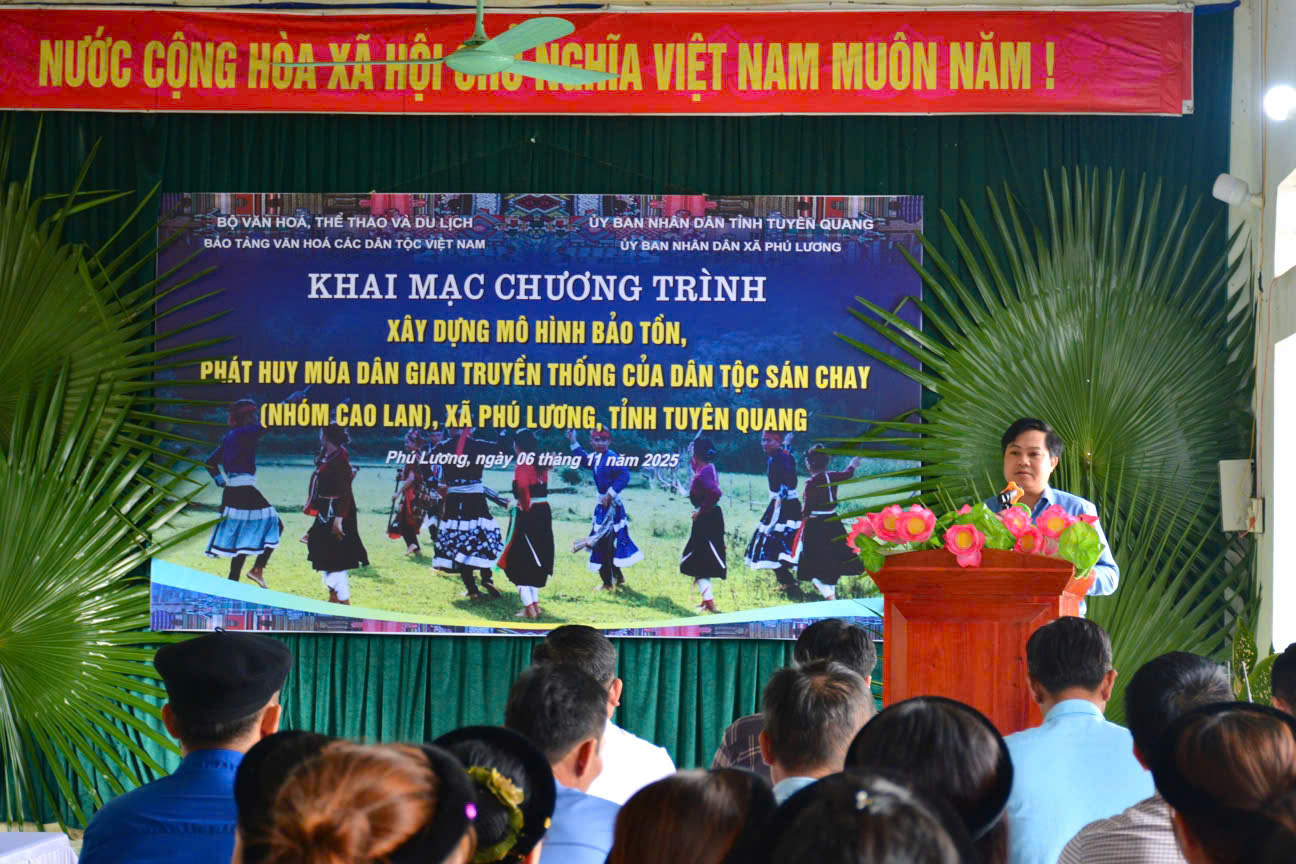 Sáng ngày 06/11/2025, Bảo tàng Văn hoá các dân tộc Việt Nam phối hợp với Sở Văn hóa, Thể thao và Du lịch tỉnh Tuyên Quang, UBND xã Phú Lương tổ chức khai mạc chương trình Xây dựng mô hình bảo tồn, phát huy múa dân gian truyền thống của dân tộc Sán Chay (nhóm Cao Lan) xã Phú Lương, tỉnh Tuyên Quang năm 2025, tại nhà văn hóa thôn Tân Phú 1, xã Phú Lương, tỉnh Tuyên Quang.