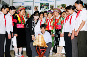 Triển lãm lưu động tại Trường Nội trú huyện Quản bạ, tỉnh Hà Giang, 1/2004. Học sinh đang trải nghiệm tập đánh đàn T`Rưng